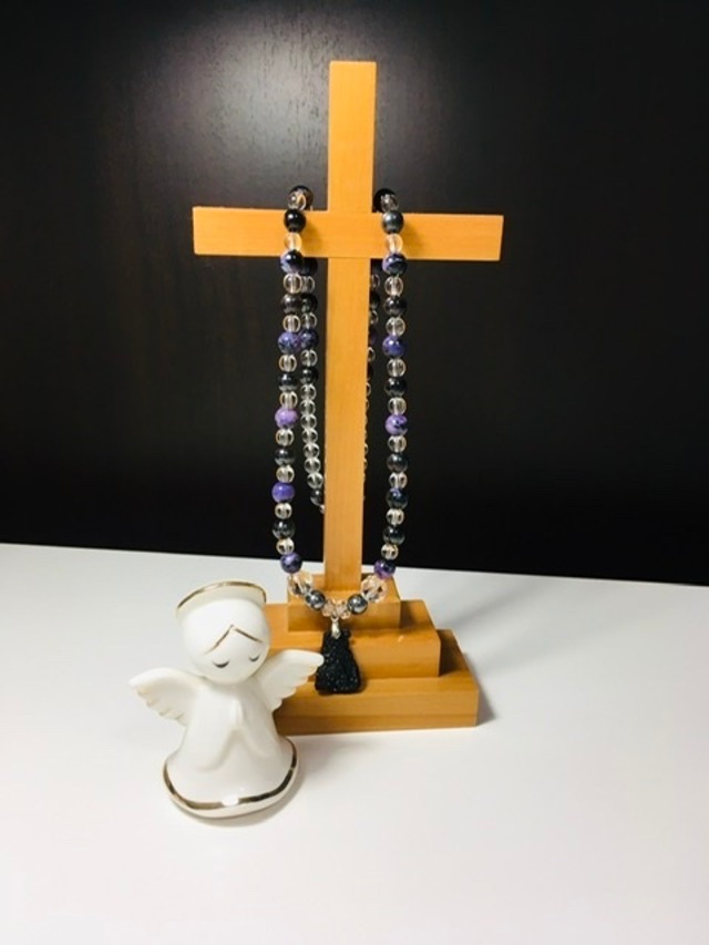 強力な魔除けと保護シールドが必要な方の為のネックレスです。 シックな色とデザインが、大人の魅力を醸し出しています。 世界3大ヒーリングストーンのなかの2種類、スギライト(ブラック)とチャロアイト(黒も入っている)がたっぷり使われています。 深い癒しの力を宿しているのはもちろんですが、スギライトの黒色の石は、魔を祓い、光の保護膜をはってくれます。私が身に着けた途端に、ざあっと膜がはられるような感覚を感じて強力な守りを体感しました。 そして、チャロアイトは抑圧された感情を解き放つ効果に優れていて、肉体的には解毒を助けてくれる石です。また、このチャロアイトは、黒い部分も入っているので、闇を払います。 テラヘルツ鉱石を2つ入れているので、テラヘルツ波を放ち、健康に良い効果があります。 万能なクリアな水晶もたくさん使っているので、ネックレス全体の浄化とパワーアップになっています。 中央のペンダントは、テクタイト隕石ガラスです。 宇宙の物質と地球の物質の混合物が一緒に固まったようなものなので、パワフルで、魔を祓い、グラウンディングし、そして霊力を向上させます。黒や茶色は、テクタイトと呼ばれ、緑色はモルダバイト、黄色はリビアングラスと呼ばれます。 守護の力を必要とする方に、身につけて頂きたいネックレスです♪ (こちらの商品は、一点もので再販はございません。)