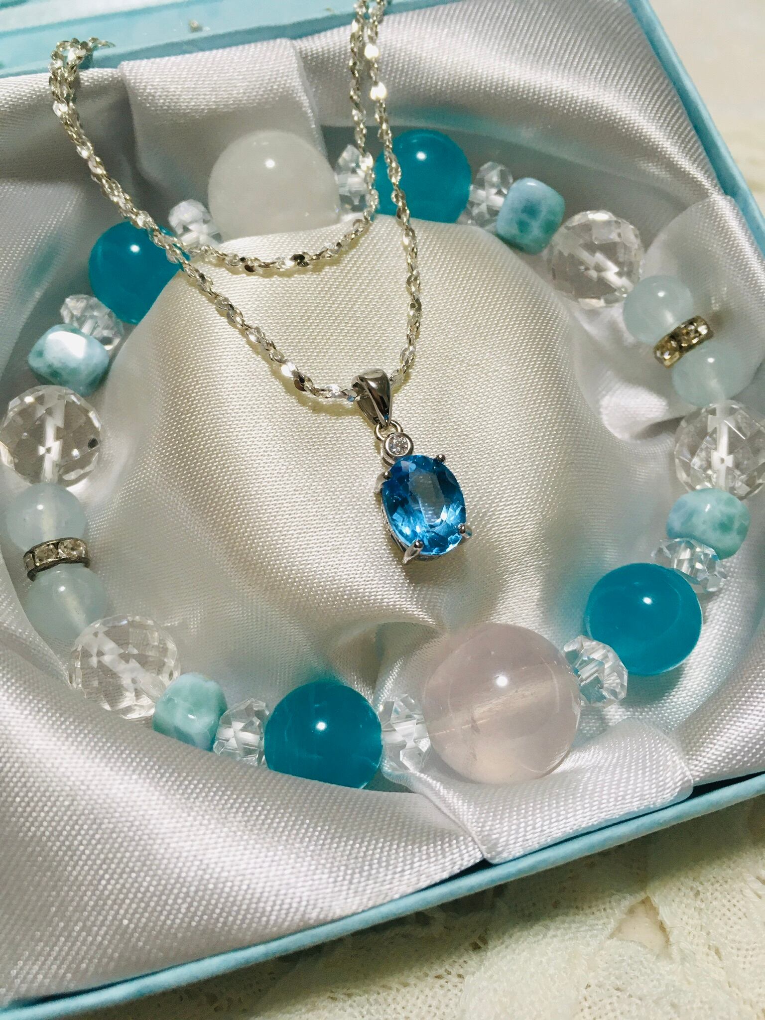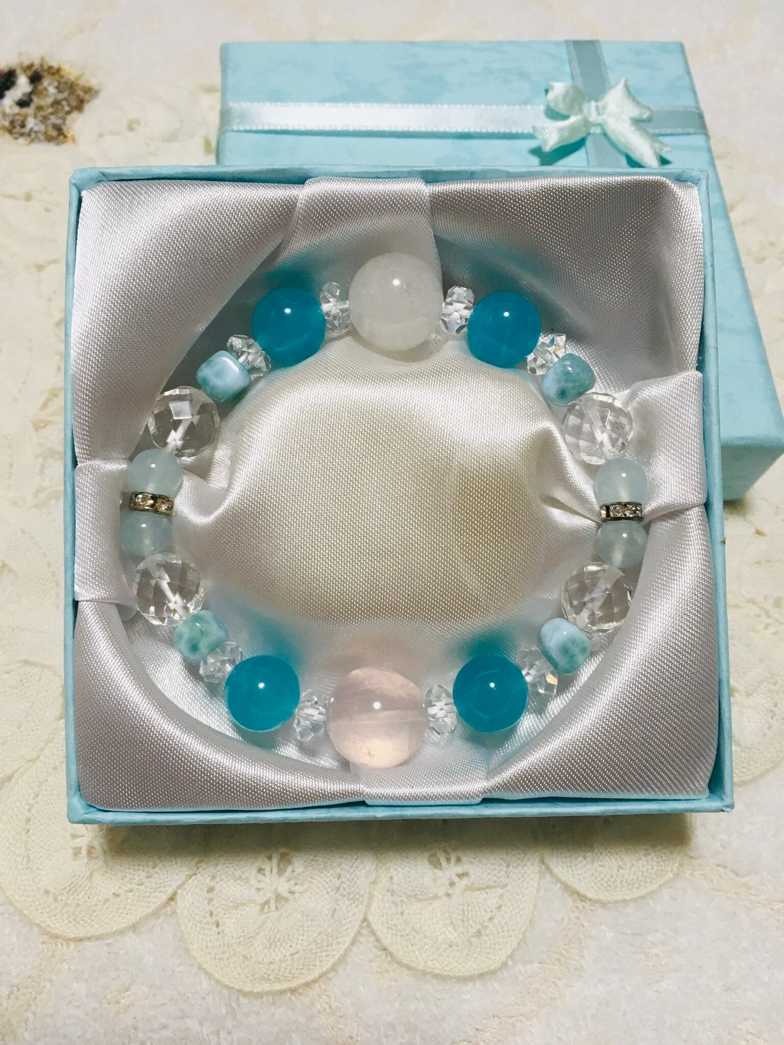 四角いラリマーを4個、ネオンアマゾナイトの10〜11mm珠4個、アクアマリンの6mm珠を4個、64面カット水晶10mm珠を4個、ボタンカット水晶を8個配しています。