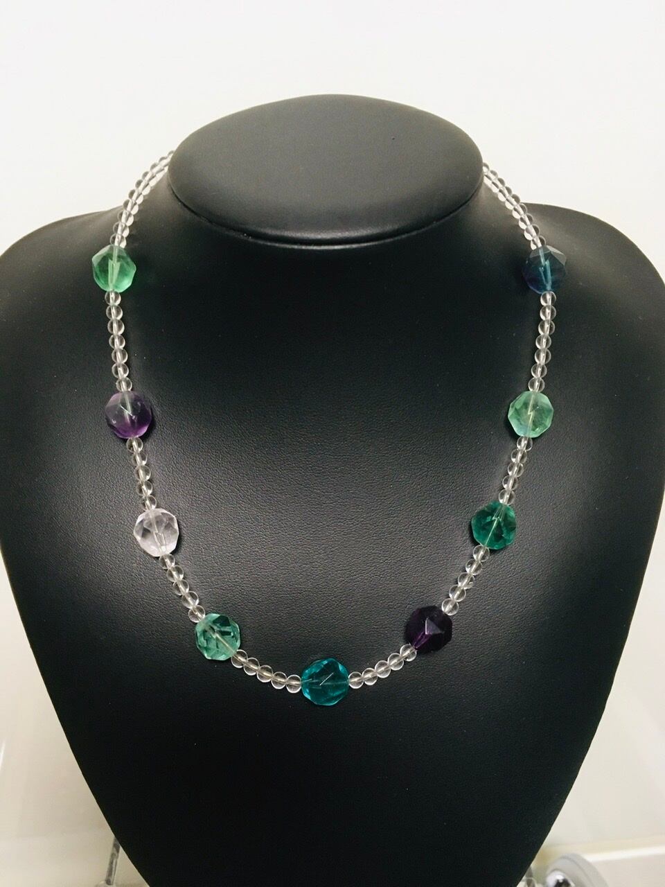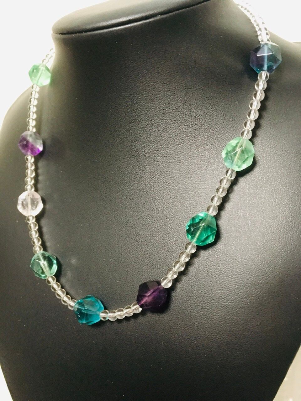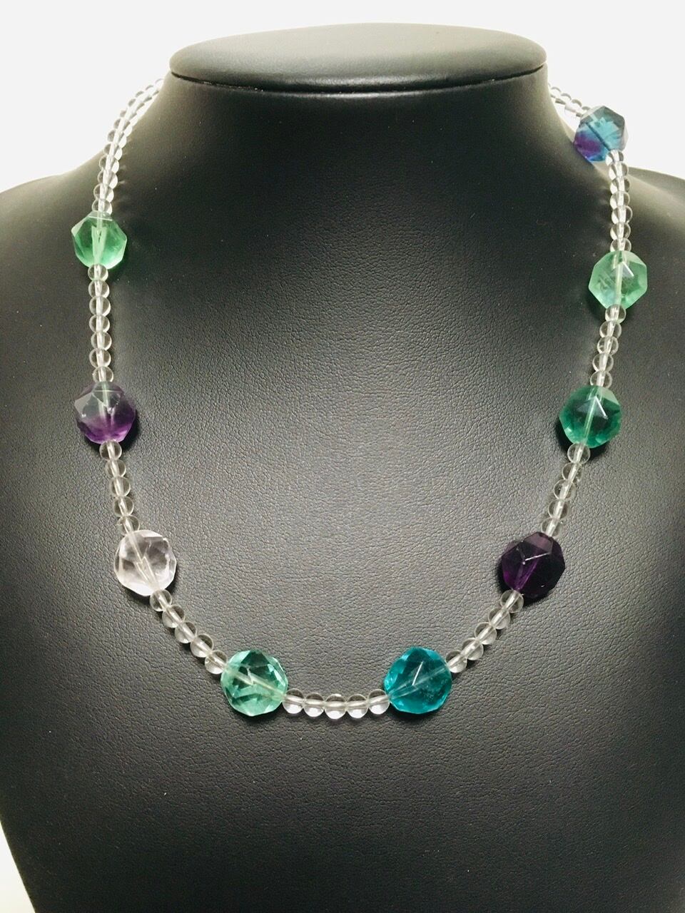 天才の石とも呼ばれるフローライトと万能な天然水晶のネックレスです。